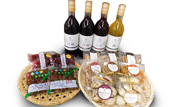 | 容量 | 福神漬150g×2袋 いくさかさん家の梅150g×2袋 かりんちゃん90g×3袋 おからくっきー(巨峰)×2袋 おからくっきー(ごま)×2袋 まめ太郎(100g)×3袋 巨峰ジュース(720ml)×2本 梅ジュース×1本 しそジュース×1本 |