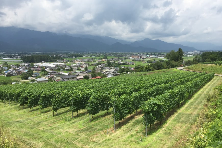 長野県安曇野地区は、西の北アルプスと東の山地に挟まれた地域で、昼夜の温度差が大きく、ブドウ栽培に適しています。