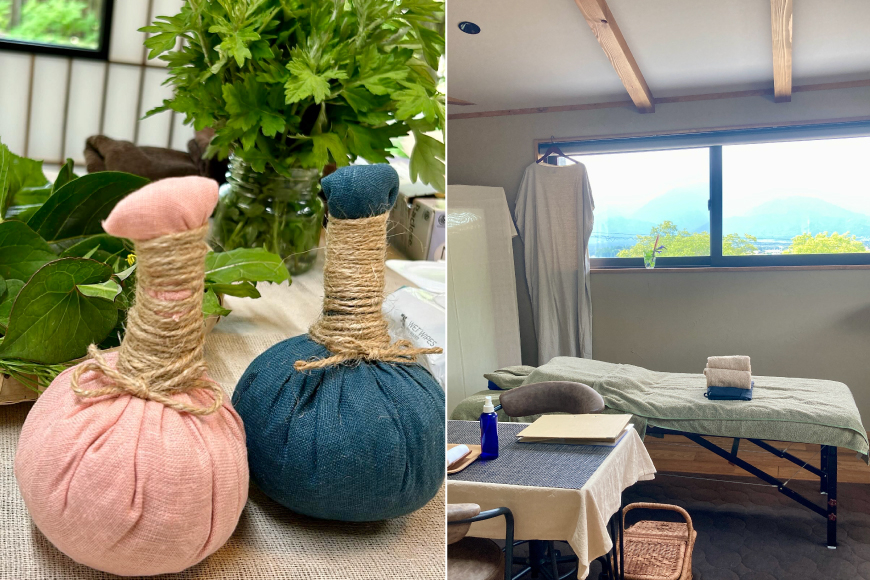 長野県池田町、雄大な北アルプスを眺望できる「CANOA YOGA studio」内のセラピールームにて、和草ハーブボールを使用したセラピー、よもぎ蒸しをご提供しています。