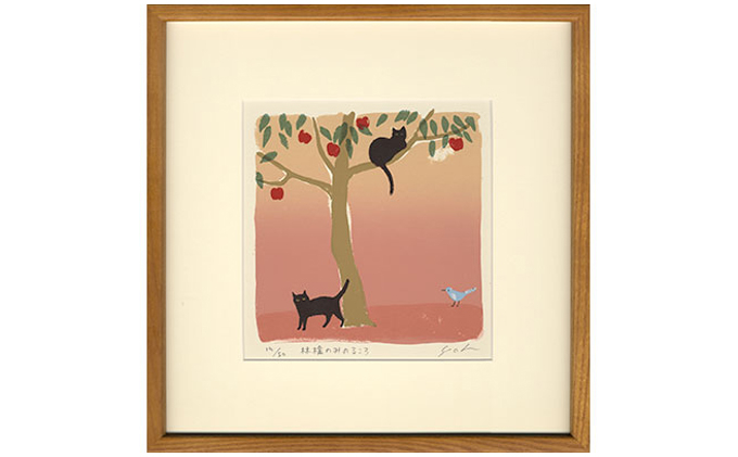 朱に溶け込む猫たちの黒色 伊藤陽版画「林檎のみのるころ」 | 版画 アート 雑貨 絵 インテリア 絵画 猫 ネコ ねこ 黒猫 黒ねこ 猫の絵 長野県 松川村
