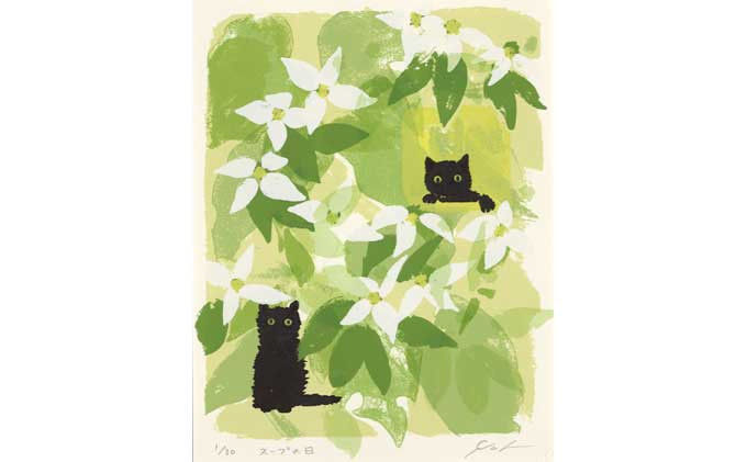 ヤマボウシの花と・・・ 伊藤陽版画「スープの日」| 版画 シルクスクリーン アート 限定版画 伊藤陽 雑貨 絵 インテリア 絵画 ポストカード 猫 ネコ ねこ 黒猫 黒ねこ 猫の絵 長野県 松川村 信州 安曇野