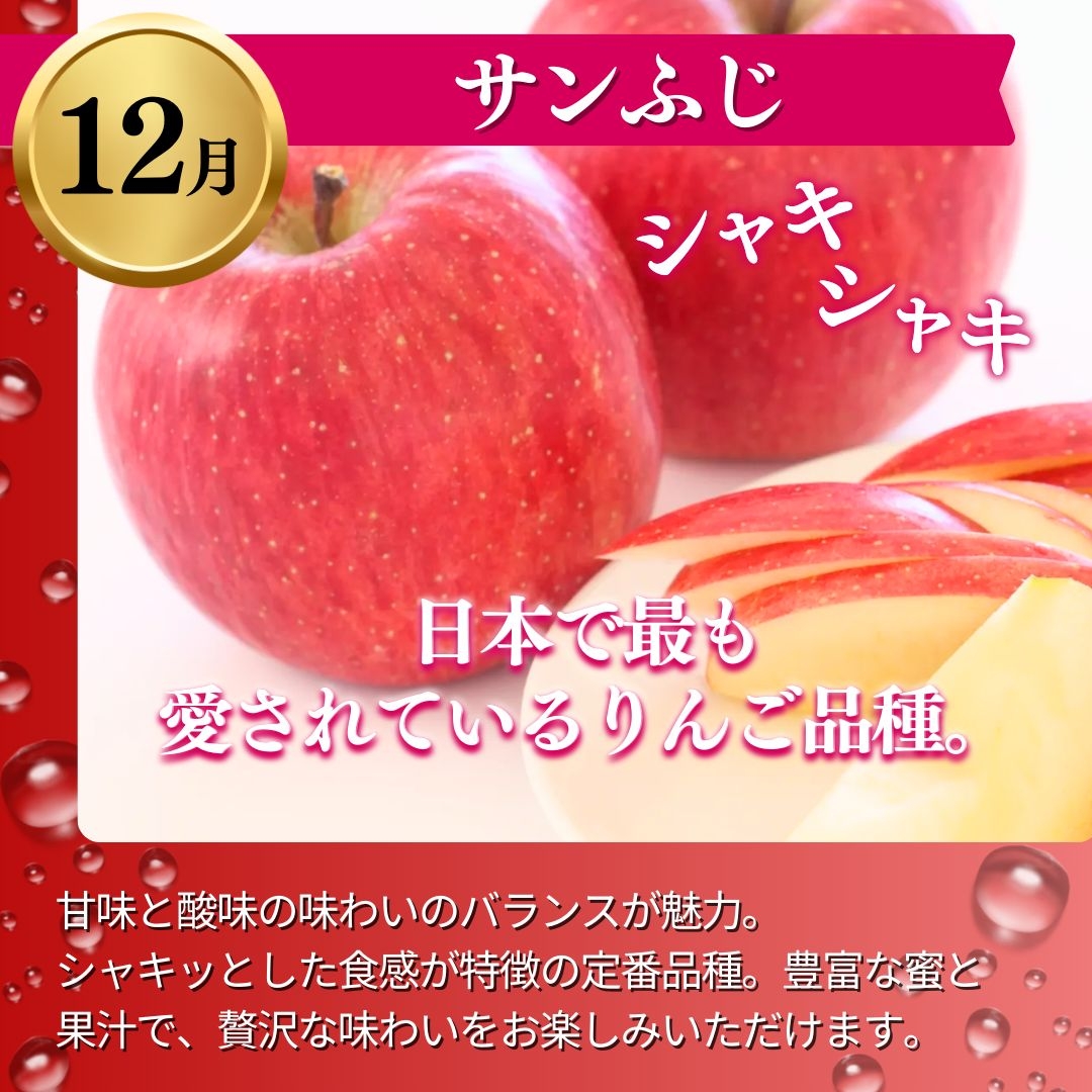| 容量 | ・10月:りんご(シナノスイート)秀14玉約5kg 山ノ内町産 ・11月:りんご(ぐんま名月)秀14玉約5kg 山ノ内町産 ・12月:りんご(サンふじ)秀16玉 約5kg 山ノ内町産 |