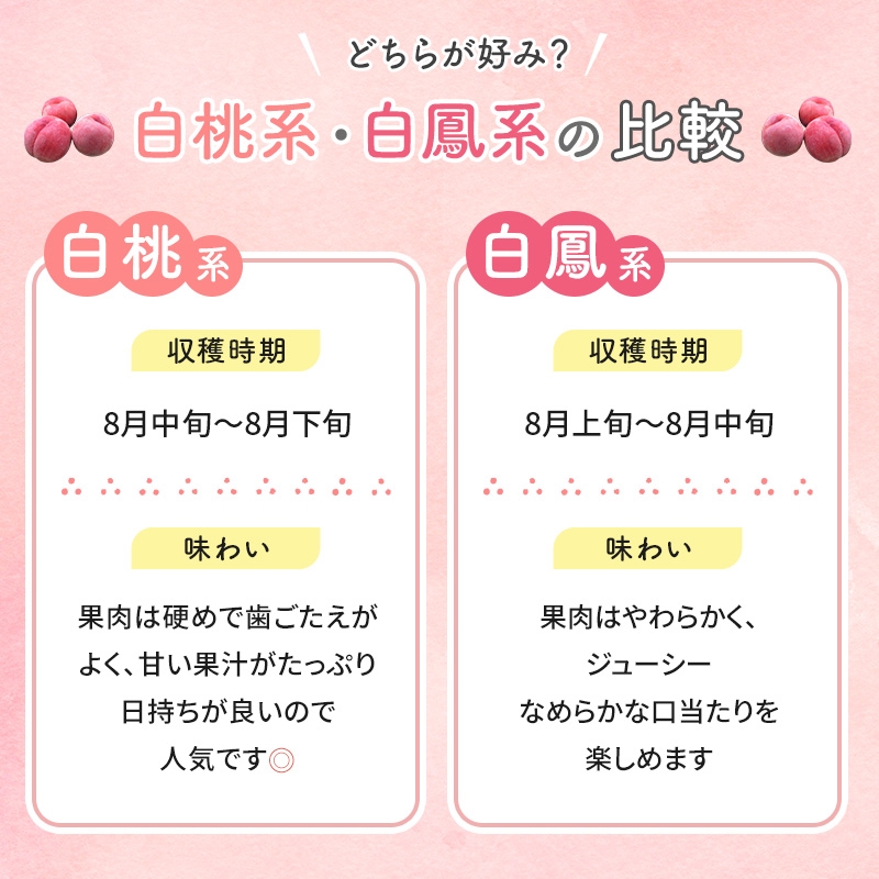 実は数えきれないほどの品種がある桃。山ノ内町の果肉の白い桃を大きく分類すると「白鳳系」と「白桃系」になります。白鳳系は白桃系に比べ、収穫時期が早く果肉は柔らかめです。山ノ内町の白鳳系の収穫時期は8月上旬からお盆にかけてとなります。収穫期間が短く、天候により前後しますのでお届け日の指定は致しかねます。予めご了承下さい。