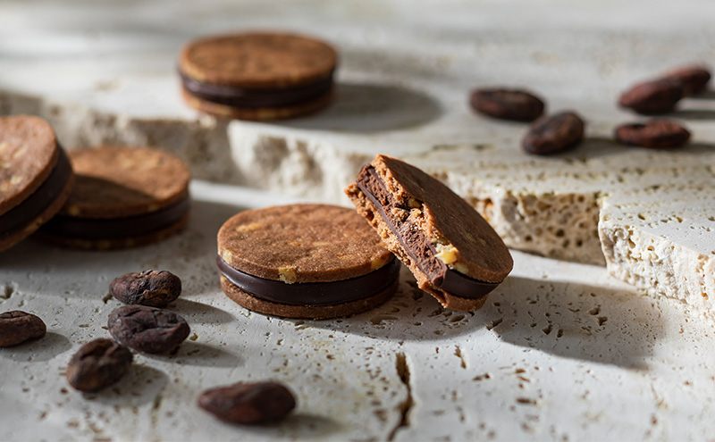 【oNCHOCOサンド】口当たりなめらかな温度で仕上げた濃厚なチョコレートガナッシュを、サクサクの自家製クッキーでサンドしたメイン商品です。