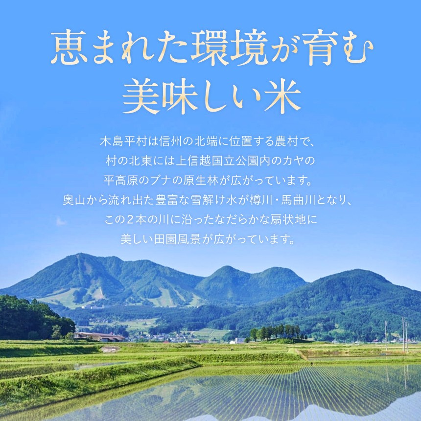 北信州木島平村は、上信越高原国立公園一帯から流れくる豊富な雪解け水と湧水、昼夜の寒暖差が良質のお米を育みます。この地で丹精込めて育てたお米は、ふっくらとした炊きあがりと甘み、粘りが際立ちます。
