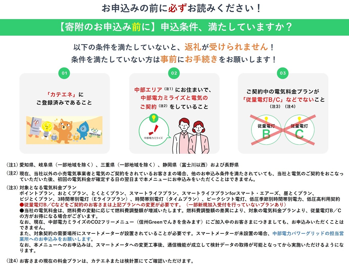 | 申込期日 | 【★★重要★★ 】 お申込みにあたり、必ず事前に申込条件をご確認ください。申込条件は、中部電力ミライズ WEB サイト(ふるさと納税× Green でんき)で確認可能です。 ■何度もお申込み可。 ■お客さまの電気料金へ返礼金額分を充当させていただくのは、返礼開始日から 6 か月間となります。 申込条件の確認はこちら https://katene.chuden.jp/clubkatene/move/moveToTaxDonationEntry.do |