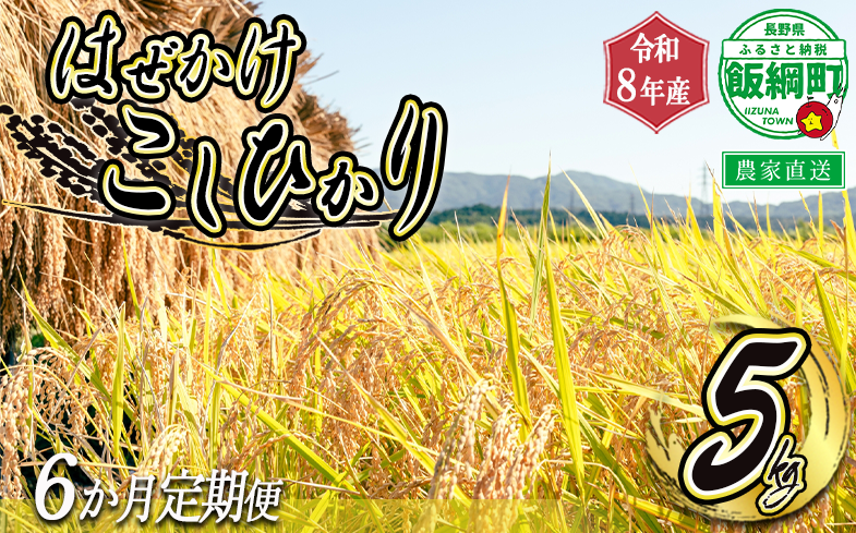 チョイス公式ポイント交換対象 手間ひまかけて、太陽の光と自然の風で乾燥させる「はぜかけ米」です。 米 こしひかり 5kg × 6回 【 6カ月定期便 】 ( 令和8年産 ) 黒柳さんのお米 はぜかけ 沖縄県への配送不可 2026年11月上旬頃から順次発送予定 コシヒカリ 白米 精米 お米 信州 予約 農家直送 長野県 飯綱町 [0281]