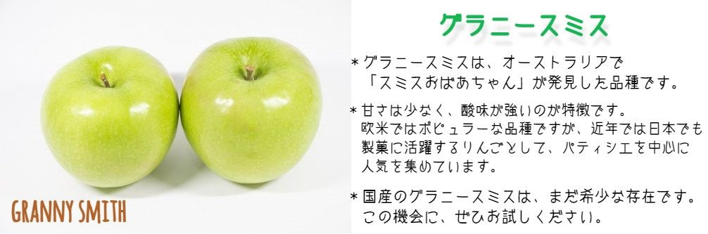 毎年、長野からりんごを取り寄せています。色々な種類を取り寄せますが、グラニースミスは初めてで、楽しみにしていました。今年は、亀虫の被害もあり、りんご農家さんは皆さん大変だった様です…しかし、届いたりんごは立派でツヤツヤ、綺麗でした。グラニースミスは、柔らかめのりんごで、甘みより酸味があり、お菓子作りにぴったりです。でも、生のままでも十分に美味しく、また是非リピートしたいと思います。