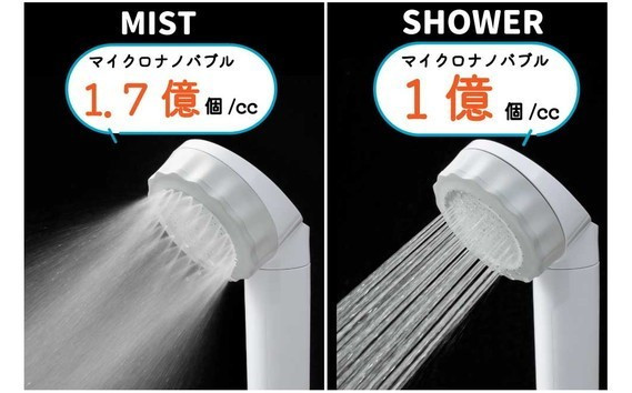 ミスト時に約1.7億個/cc、シャワー時に約1億個/ccのマイクロナノバブルが発生。