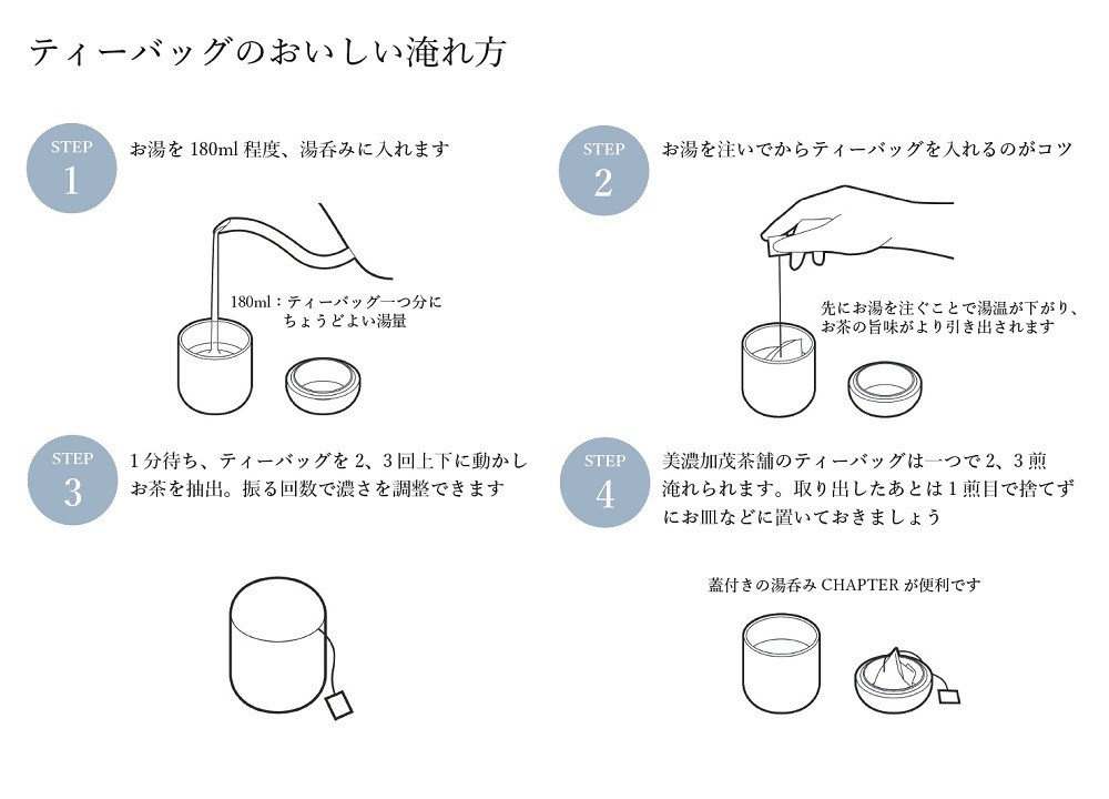 | 容量 | CHAPTER[チャプター](クリアグレー):1つ 煎茶(ティーバッグ):3g✕X8個入りX1袋 ほうじ茶(ティーバッグ):3gX8個入りX1袋 和紅茶(ティーバッグ):3gX8個入りX1袋 |