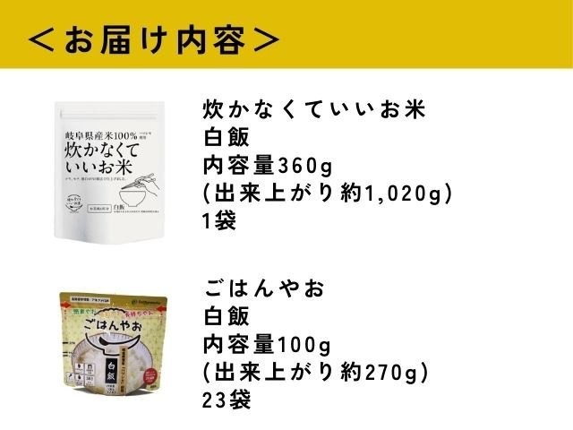 | 容量 | 炊かなくていいお米 白飯 360g 1袋 ごはんやお 白飯 100g 23袋 |