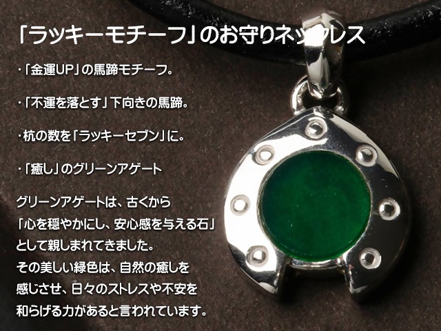 幸運 モチーフ の シンプルなホースシューと邪気を払うグリーンアゲートの組合せ。