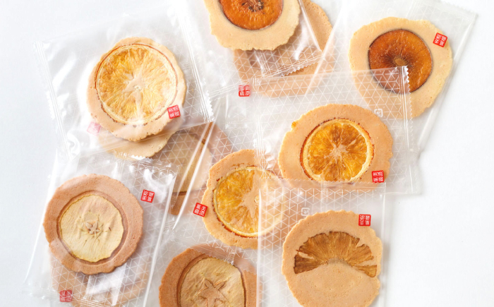 | 容量 | フルーツせんべい りんご:6枚,オレンジ:6枚,キウイ:6枚,パイナップル:6枚 フルーツゴーフレット いちご:5枚,レモン:5枚 【加工地】 岐阜県岐阜市 |