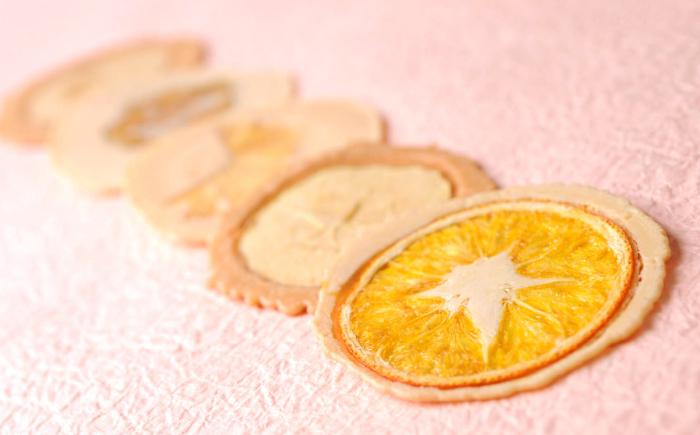 せんべいの生地にフルーツの果汁を入れて焼いていますので、味・香りをお楽しみいただけます。(ゴーフレットの生地には入っていません。)