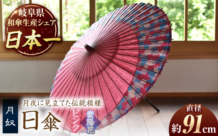 職人手づくりの日傘。月をモチーフにしたデザインで爽やかな印象に。 【岐阜和傘】日傘 月奴(ピンク×紫陽花) かさ 手作り 40本骨 岐阜市/仐日和 [ANBY006]