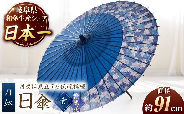 職人手づくりの日傘。月をモチーフにしたデザインで爽やかな印象に。 【岐阜和傘】日傘 月奴(青×紫陽花) かさ 手作り 40本骨 岐阜市/仐日和 [ANBY007]