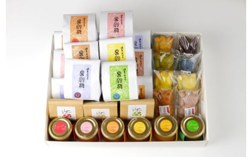 | 容量 | ・かりんとう:40g×20袋 ・マドレーヌ:35g×8個 ・ジャム:50g×6個 |