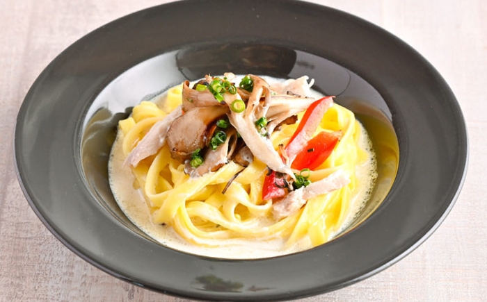 モチモチした食感で食べごたえのある平打ちパスタ麺。
