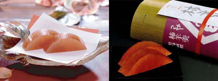 柿羊羹は四代目右助が天保九年(1838年)に、堂上蜂屋柿の濃密な甘味に注目して、