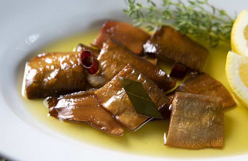 スモーク鮎アヒージョ:鮎、オリーブオイル、食用油、塩、にんにく、唐辛子、粒胡椒、ローリエ、ローズマリー