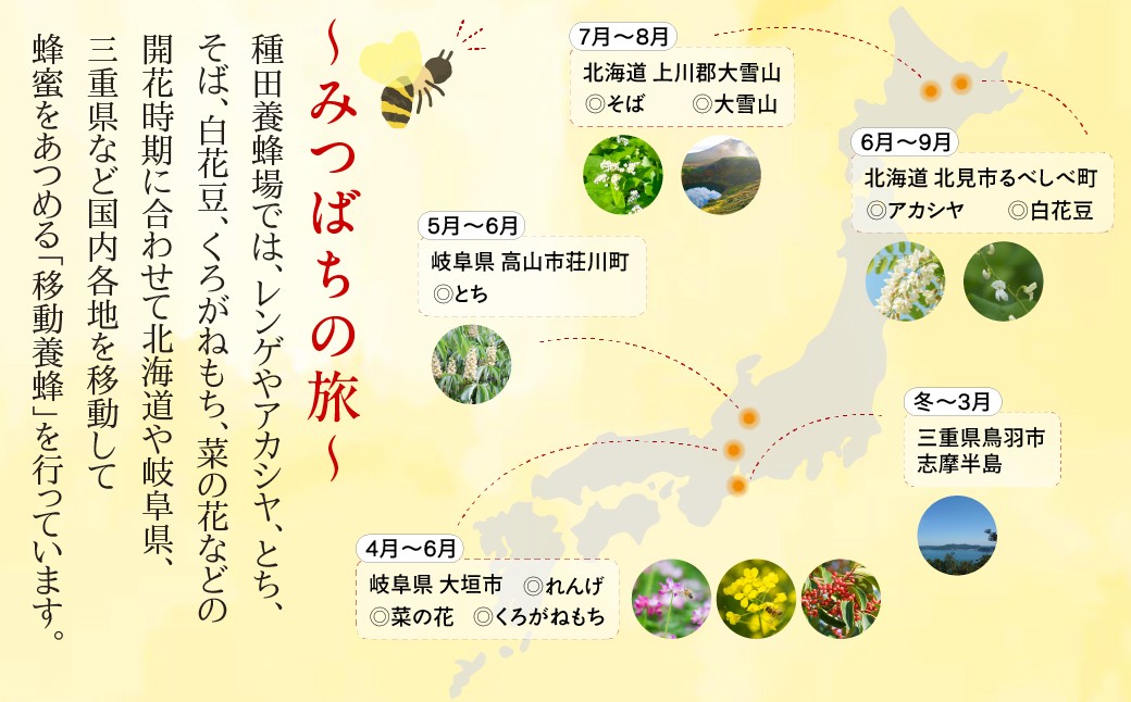 昭和23年の創業以来、種田養蜂場は「自然のままのおいしさ」を届けることにこだわってきました。採れた蜂蜜には一切手を加えず、みつばちが集めたままの風味と栄養を生かしてお届けしています。採蜜のタイミングを見極めるため、季節ごとの花の咲き具合を細かく判断し、最も良い状態の蜂蜜だけを採取しています。ベストの瞬間を逃さないよう、蜂箱ごと移動し、地域ごとに違う個性豊かな蜂蜜を採れる工夫を続けています。