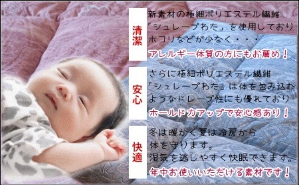 | 容量 | 1枚 サイズ:約150×210センチ(シングルサイズ) 生地:表(プリント)/裏(無地)綿100%(205本ブロード) 中身:ポリエステル100%(東洋紡シュレープ®) わた量:約1.8kg カラー:ピンク |