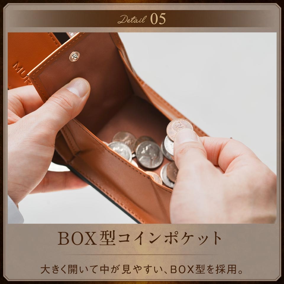 小銭入れは大きく開くBOX型で、中身が見やすく取り出しやすい設計になっています。