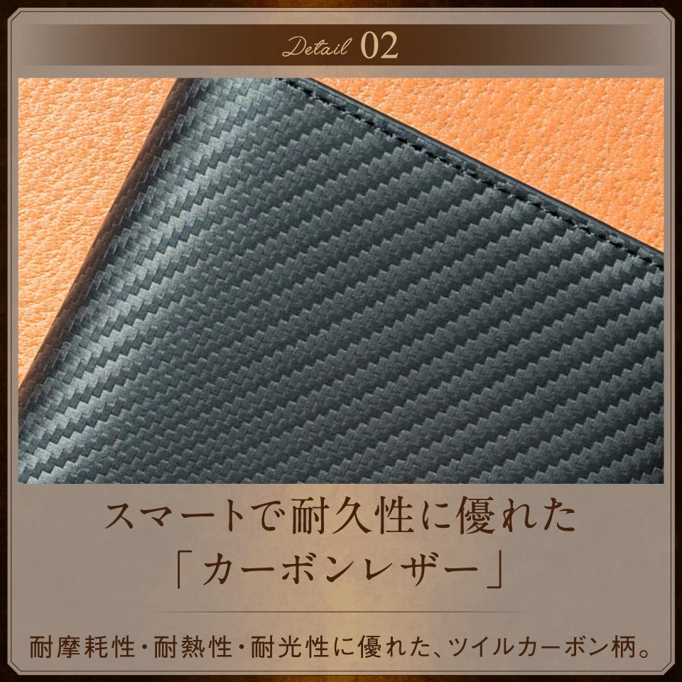 カーボンレザーとコードバン調仕上げが魅力の二つ折り財布。