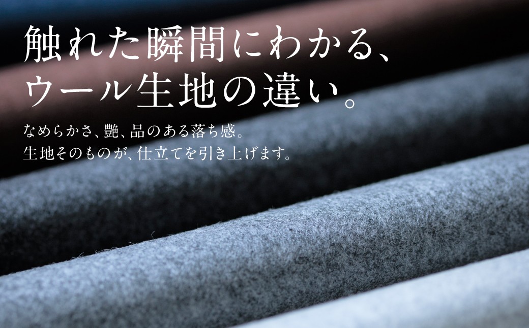 国産ウールの高級服地から選び、体型や用途に合わせて一着ずつ丁寧にお仕立てします。