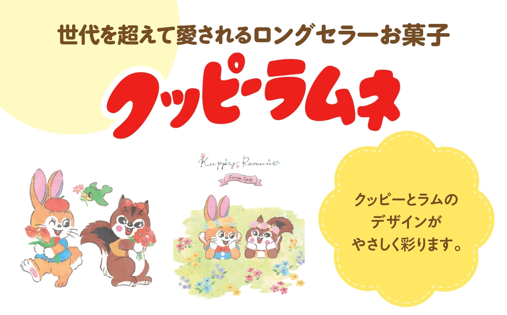 表には可愛らしい笑顔で花束を持っているクッピーとラムとピッピが仲良く寄り添っており、裏には 花畑でのんびりくつろいでいるクッピーとラムがデザインされています。 どちらの面を見ても楽しめる、贅沢なアイテムに仕上げました。