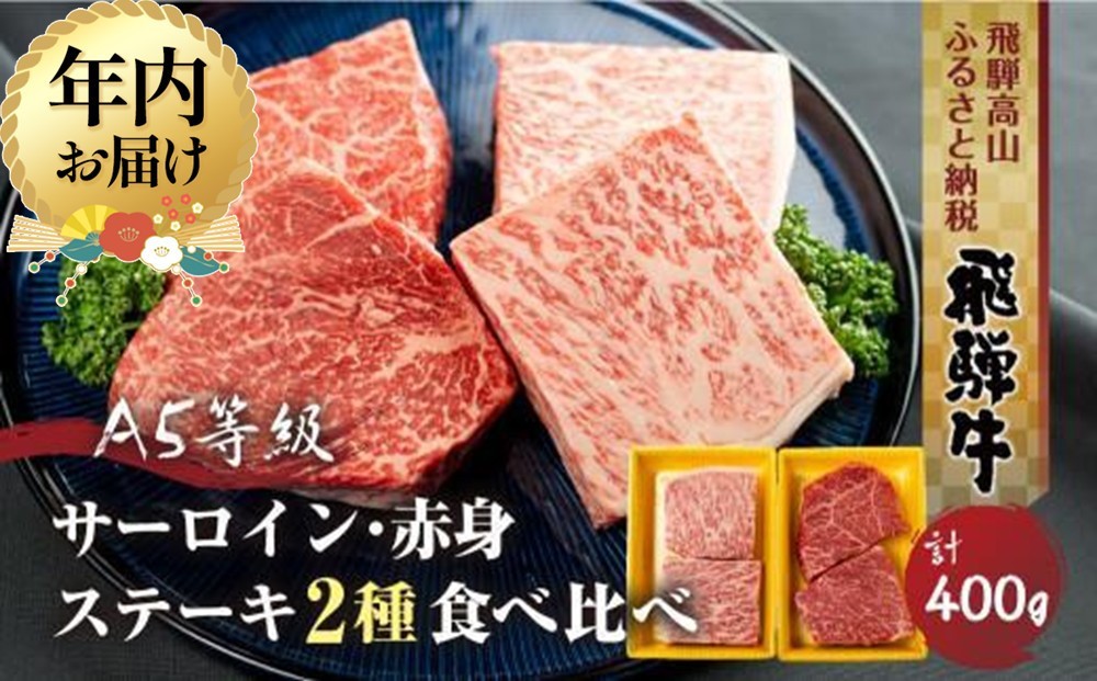 贅沢とろけるサーロインと上質赤身のステーキ 2種食べ比べ 【年内配送が選べる】2種食べ比べ ステーキ! 飛騨牛 A5等級 ステーキ 400g (サーロイン200g+もも200g) | 発送時期が選べる 年内発送 黒毛和牛 ブランド牛 人気 おすすめ 真空パック 丹生川精肉 JJ008VP