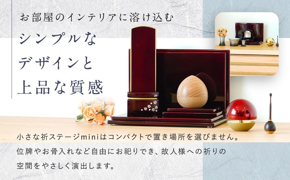 | 容量 | 祈りステージmini 1基 サイズ:高さ13cm×幅19cm×奥行15cm カラー:紅春慶 【原材料名】 無垢材・植物性合成漆 |