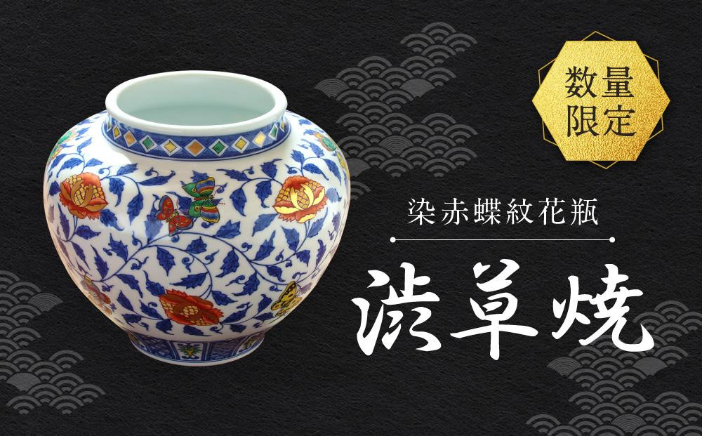 チョイス限定 渋草調の色をふんだんに使った鮮やかな作品 【数量限定】染赤蝶紋花瓶【渋草焼】| 花瓶 陶器 焼き物 インテリア 高級 飛騨高山 (株)芳国舎渋草製陶所 DE009