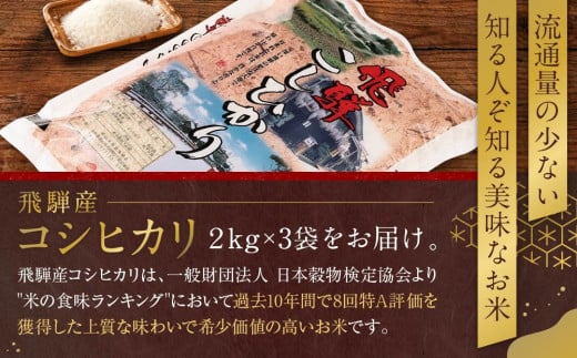 これは旨い!稀少米! 流通量が少ない隠れた名品です 令和7年度産 飛騨産コシヒカリ 白米(2kg×3袋)| 特A評価獲得米 精米 米 もちもち 白飯 高山米穀協業組合 FA013