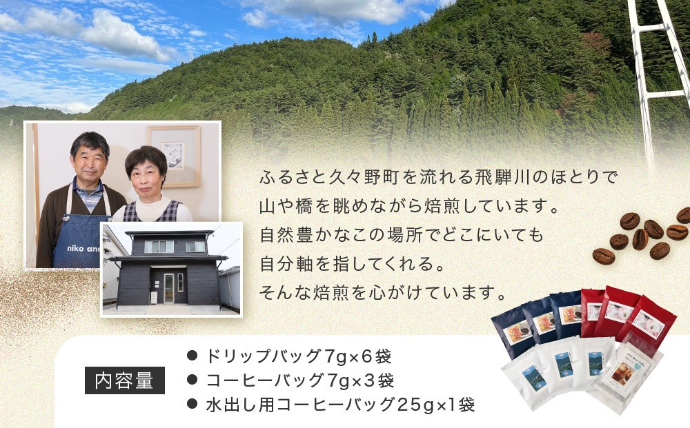| 容量 | ドリップパッグ 7g×6袋 コーヒーバッグ 7g×3袋 水出し用 コーヒーバッグ 25g×1袋 原材料:珈琲豆 原産地:ブラジル・コロンビア・エチオピア 製造・加工地:高山市久々野町店舗 |