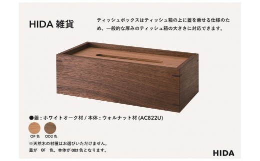容量 | ●内容:ティッシュBOX(AC822U) ●主材:蓋:ホワイトオーク材 本体:ウォルナット材 ●サイズ:W26.5×D14×H8.5 ●塗色:オイル仕上げ(蓋:OF色 本体:OD2色) ※詳細は飛騨産業公式ホームページをご覧ください。 |