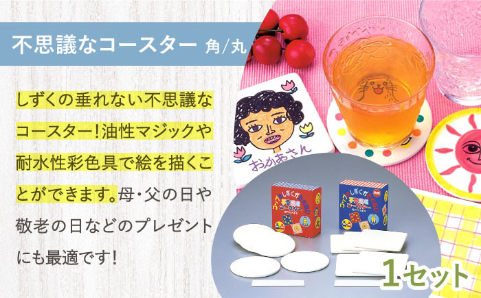 しずくの垂れない不思議なコースター!水滴の付いたグラスを置くと、コースターが垂れてきた水滴を吸収してくれるので、持ち上げた時にしずくが垂れにくくなります。油性マジックなどの耐水性彩色具で絵を書いて、オリジナルコースターが作れます。母の日や、敬老の日のプレゼントにも最適!テーブルなどが傷付かないように底面保護シールが付いています。