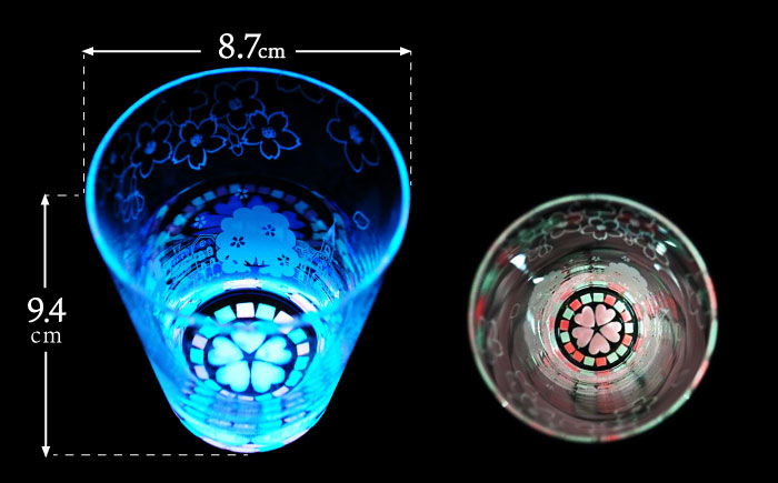 グラス底面には、弊社独自の特許技術で、光をためる事で暗闇で幻想的に光る特殊な蓄光材を埋め込みました。