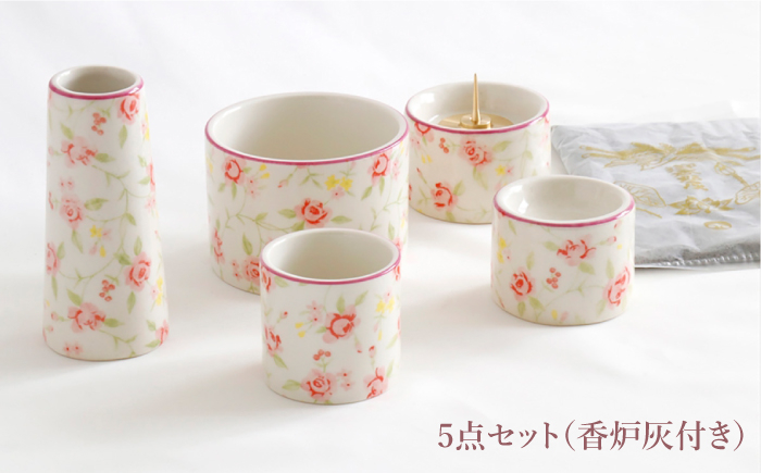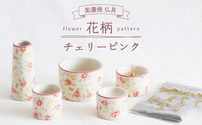 法具 仏壇飾り ピンク モダン \仏具もおしゃれに/【美濃焼】 仏具花柄 5点セット 香炉灰付 『チェリーピンク』 インテリア 仏壇 お供え 多治見市/佐々木陶器 [TAJ013]