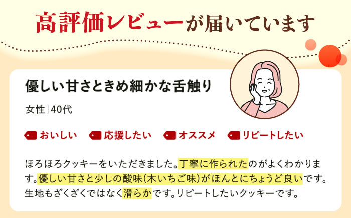 ほろほろクッキーをいただきました。丁寧に作られたのがよくわかります。優しい甘さと少しの酸味(木いちご味)がほんとにちょうど良いです。生地もざくざくではなく滑らかです。リピートしたいクッキーです。