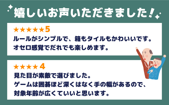 1ゲームにかかる時間は5分くらいで、どなたでも手軽に遊ぶことができます。ルールは6歳のお子さまでもすぐに遊べるほど簡単。これまであまりボードゲームをやったことがない方にもおすすめです。さらに、囲碁やオセロのように、遊べば遊ぶほど奥の深いゲームになっています。ゲームの中盤から終盤にかけて、コマが連続して積み上がっていく展開は、ほかのゲームでは味わえないほど爽快です!