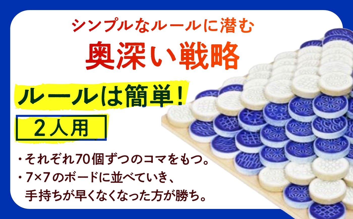 | 容量 | 【内容】 ■コマ ×142個 (2色×各71個) ■ゲーム盤 ×1点 ■ルール説明書 ※専用化粧箱に入れてのご提供となります。 パッケージサイズ:21×21×5cm 重量:1,300g 【原料原産地】 ゲームに使われているコマには、多治見市の特産品である美濃焼タイル(モザイクタイル)を使っています。ゲーム盤とパッケージも多治見市内のメーカーで製作されています。 【加工地】 多治見市内の工房でひとつずつ手作業で制作しています。 【お申し込み前に必ずお読みください】 お届けする返礼品には個体差が生じる場合があります。下部記載の「個体差について」、「返礼品が届いたら」を必ずご一読のうえ、お申し込みください。 【色について】 商品写真はできる限り実物の色に近づけるよう徹底しておりますが、 お使いのモニター設定、お部屋の照明等により実際の商品と色味が異なる場合がございます。 |