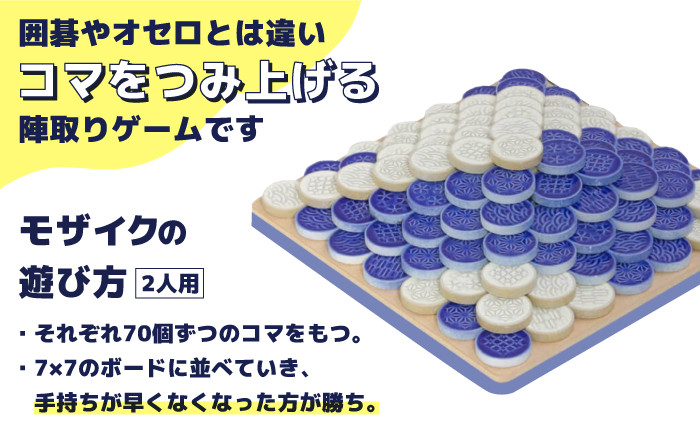 「モザイク」は、美濃焼の岐阜県多治見市産モザイクタイルをコマに使った2人用のボードゲームです。6歳のお子さまでもすぐに遊べるほど簡単なルールで、しかも囲碁やオセロのように奥の深いゲームになっています。一度遊んでいただければ、その面白さは折り紙つき。ゲームの中盤から終盤にかけて、コマが連続して積み上がっていく展開は、ほかのゲームでは味わえないほど爽快です!ぜひご家族やお友だちと新しい遊びの世界をのぞいてみてください。