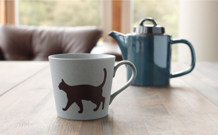 なんと・・・カップが温まると柄が!?45度以上の飲料を入れていただくと可愛らしい猫ちゃんが浮き出てきます。そして、冷めるとまた黒のシルエットに戻ります。こんな楽しいマグカップならば、お茶の時間を盛り上げること間違いなし!!