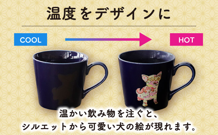 温度で変化するカップ 温感グレーズ犬マグ『チワワ』『プードル』各1個とゆる犬柄豆皿5枚のふるさと納税限定セットです。