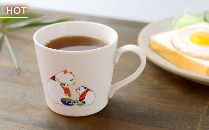 45度以上の飲料を入れていただくと白黒のパンダが可愛い和柄に変身します。常温になると白黒のパンダに戻ります。こんな楽しいマグカップならば、お茶の時間を盛り上げること間違いなし!!艶があり柔らかな乳白色の美濃焼のマグカップです。ころんと可愛く親しみやすいパンダマグと可愛い親子のパンダマグの2個セットです。