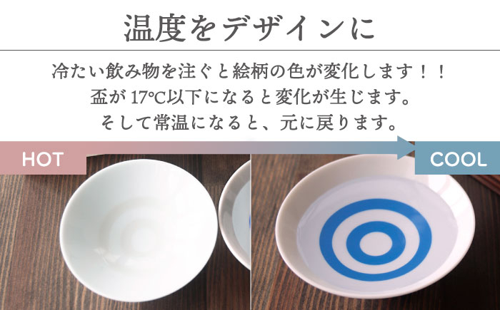 その模様は日本酒の色や濁りを見るためのもの。ぜひ冷酒を注ぎ、冷えた液体の感度を楽しみながらお飲みください。冷たいほど濃い青になります。冷感の鮮やかな色変化はお酒の時間をさらに楽しくしてくれます。17度以下の冷たい飲み物を注ぐと、蛇の目模様が浮かび上がります。盃が17℃以下になると変化が生じます。常温になると元に戻り、繰り返し楽しむことができます。平盃:白磁の美しさにこだわった盃です。鮮やかな色変化が楽しめます。