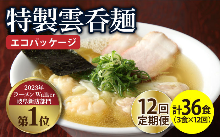 こだわり抜いた雲呑ラーメン 【12回定期便】【ご家庭用】特製雲呑麺 3食入り ※エコパッケージ※ ラーメン ワンタン 自家製 多治見市/たゆたふ [TDB009]