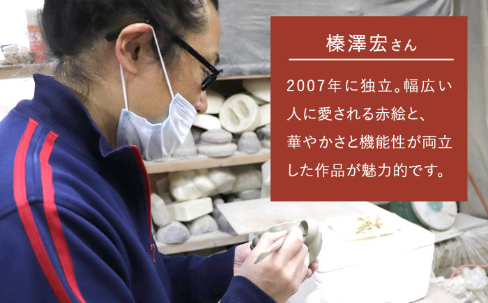 榛澤さんが描く赤絵は、非常に生き生きとしています。一つ一つ筆で、丁寧に描かれた図柄は食卓を華やかにします。「すべてが同じにならないように、一つ一つ個性が出るように作っています」と語る榛澤さんの赤絵にはこだわりがいっぱい。薄く板状に切った粘土を成形する、伝統的なたたらづくりで器を作ります。たたらづくりは、粘土が薄くて軽い分、制作が難しく技術が必要です。榛澤さんの赤絵は地元の居酒屋さんから、ミシュラン一つ星の名店まで幅広い人に愛されています。