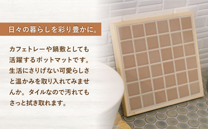 ◆日々の暮らしを居心地よく彩り豊かに一人分のカフェトレーや鍋敷として活躍するポットマットです。木製ベースに22mm角のRocheタイルを使ってデザインしました。タイルの色はウォームベージュを使用しています。目地の色はベージュです。飾っておくだけでもキッチンが華やかになりますよ♪タイル部分はティーポットや急須など、熱いものを置いても大丈夫です。(木枠部分には熱いものが乗らない様ご注意下さい)